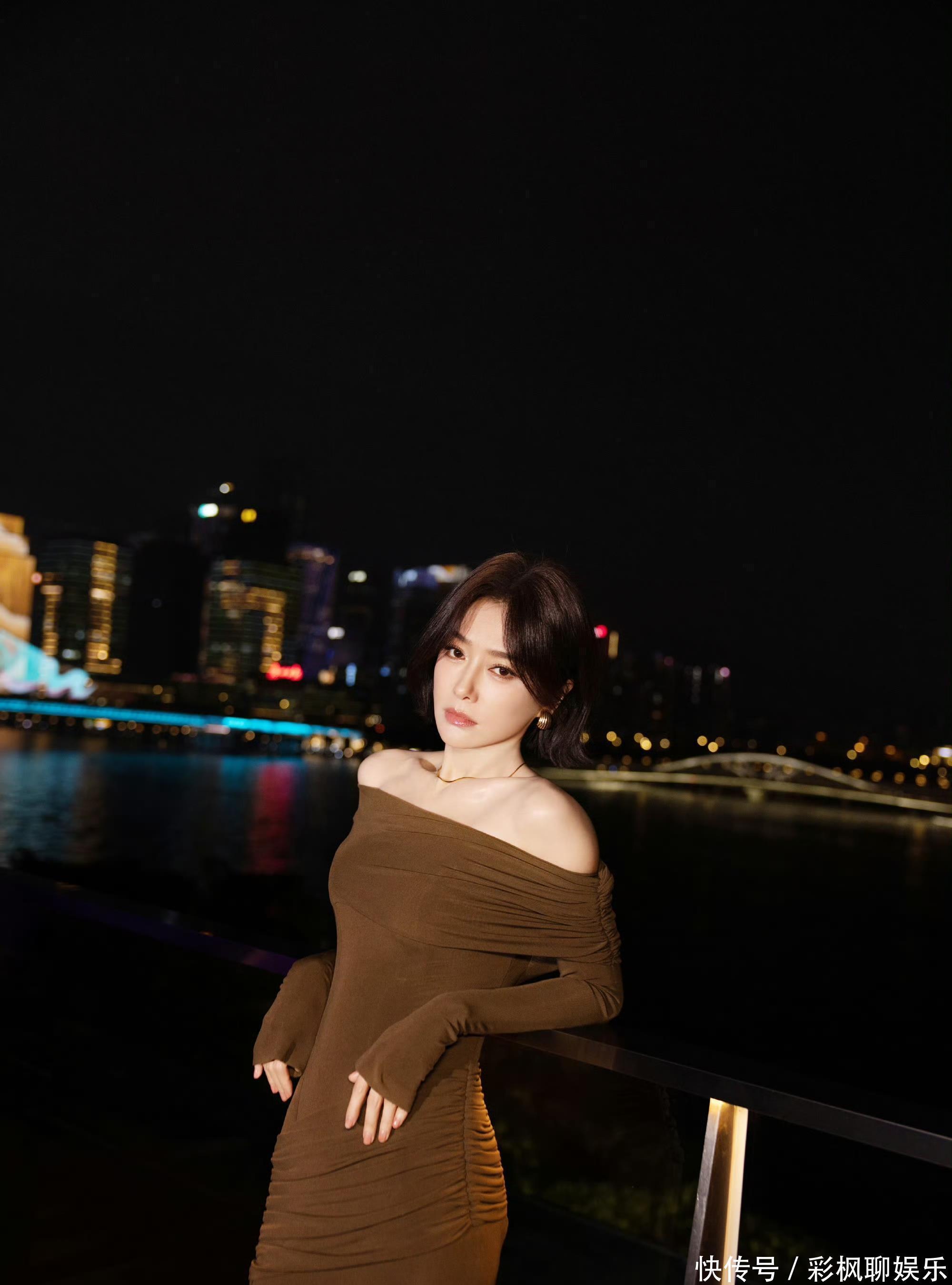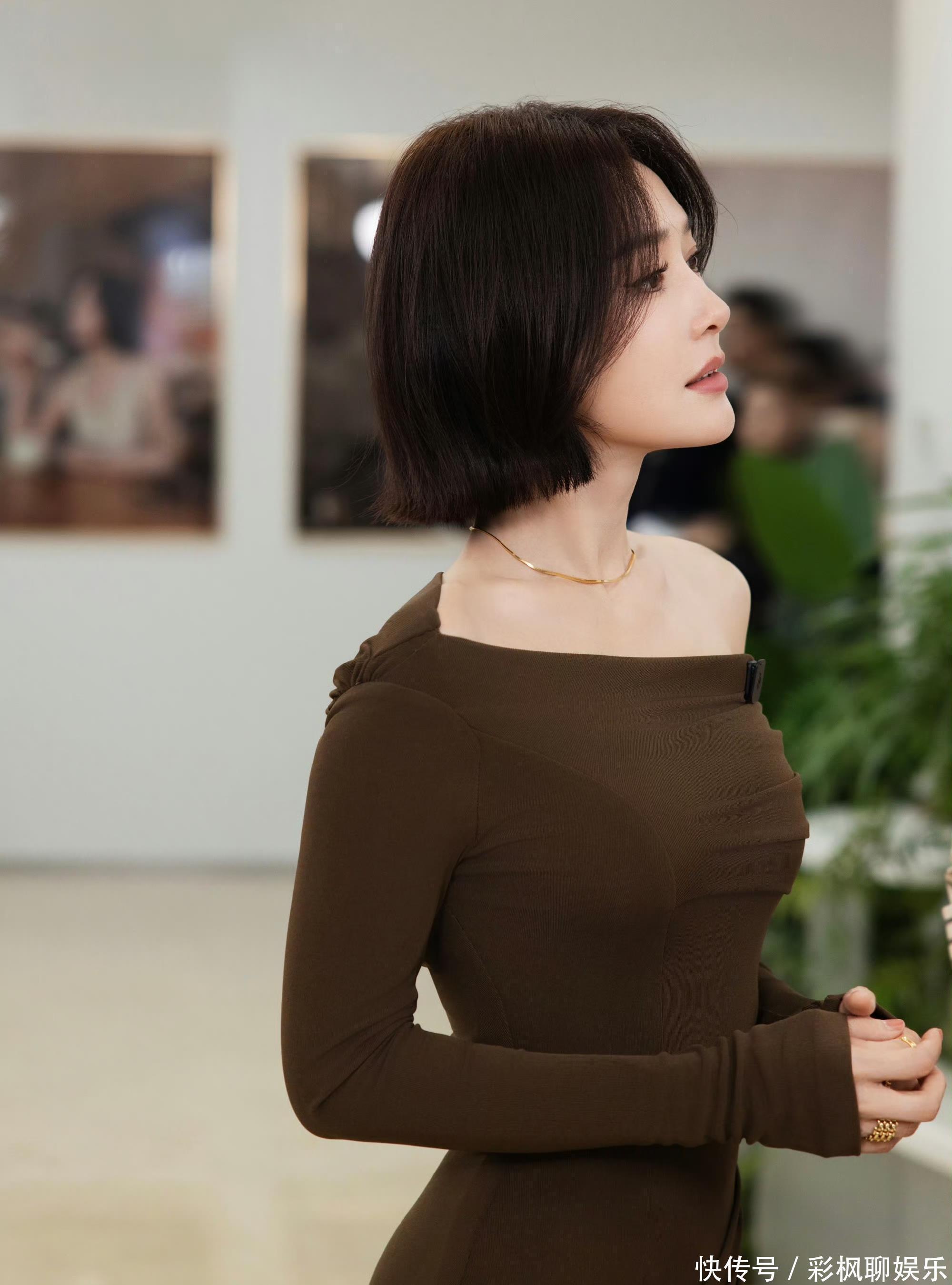 低饱和的咖色氤氲着静谧氛围,斜肩设计打破了纯色裙装的沉闷,垂坠的裙摆褶皱随动作轻晃,没有繁复的装饰,却将东方女性的端庄雅致尽数流露,愈发具象动人。